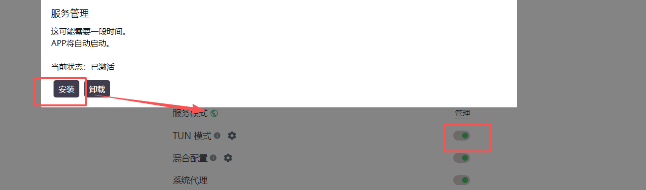 安装服务模式,重启之后出现绿色地球图标后开启TUN模式