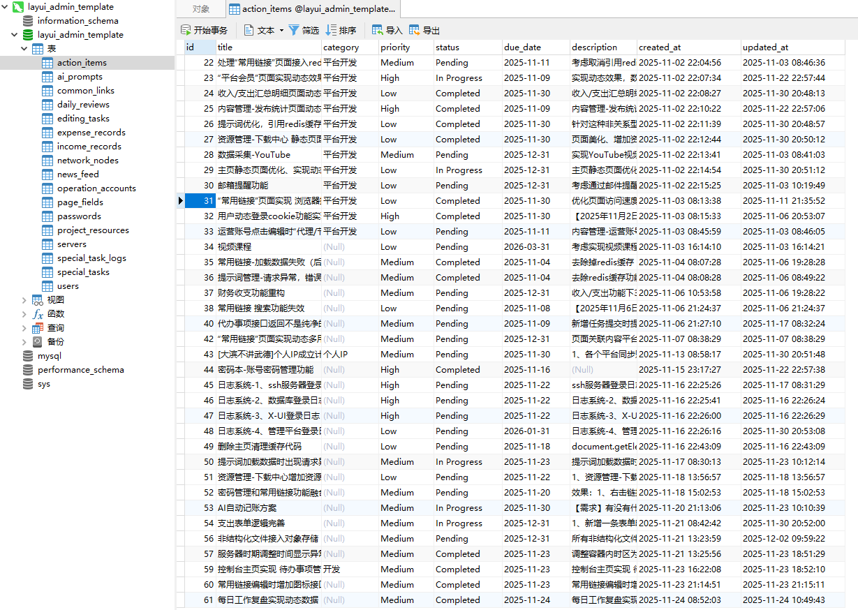 2、mysql查询 SELECT * FROM layui_admin_template.action_items