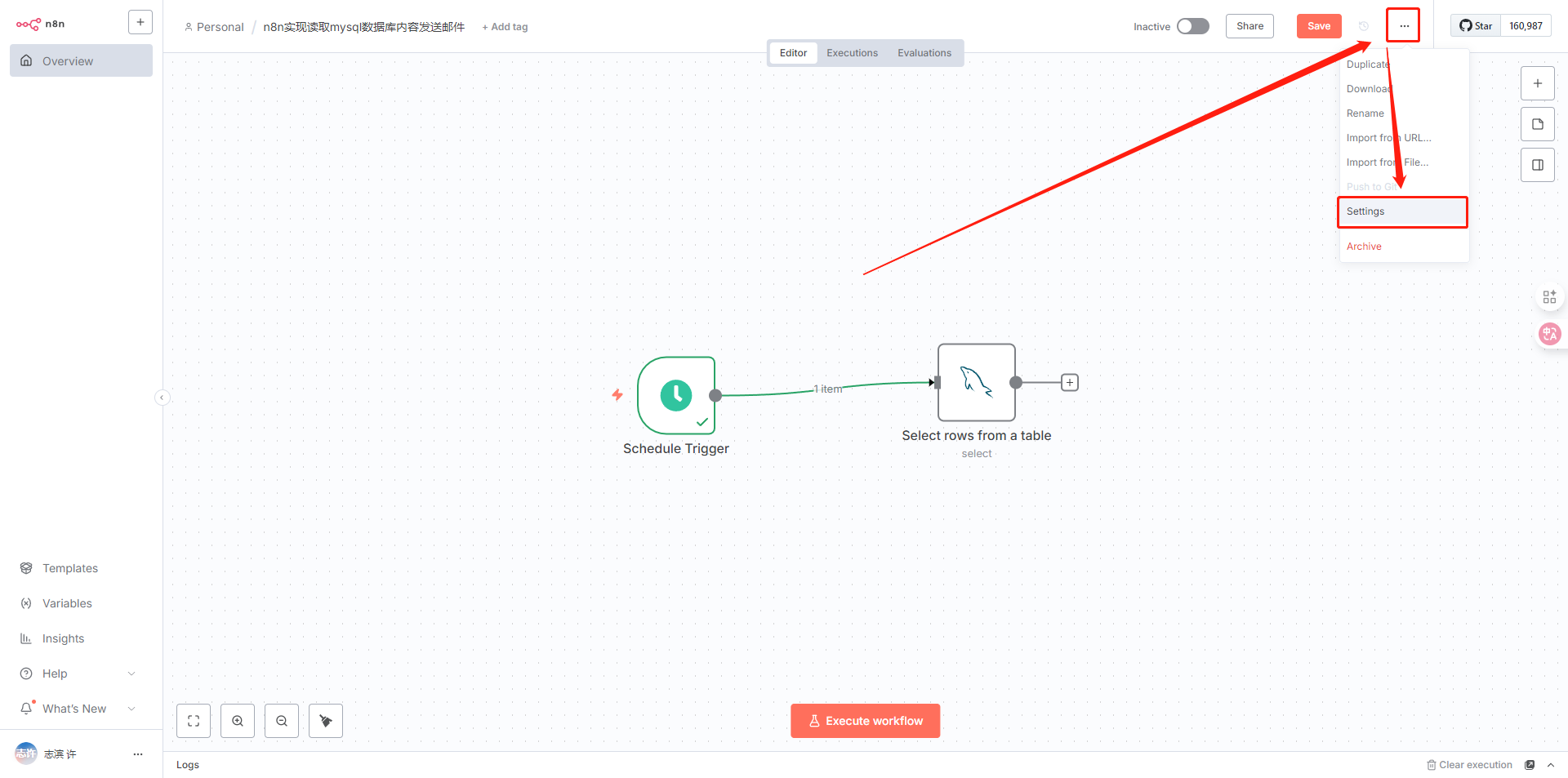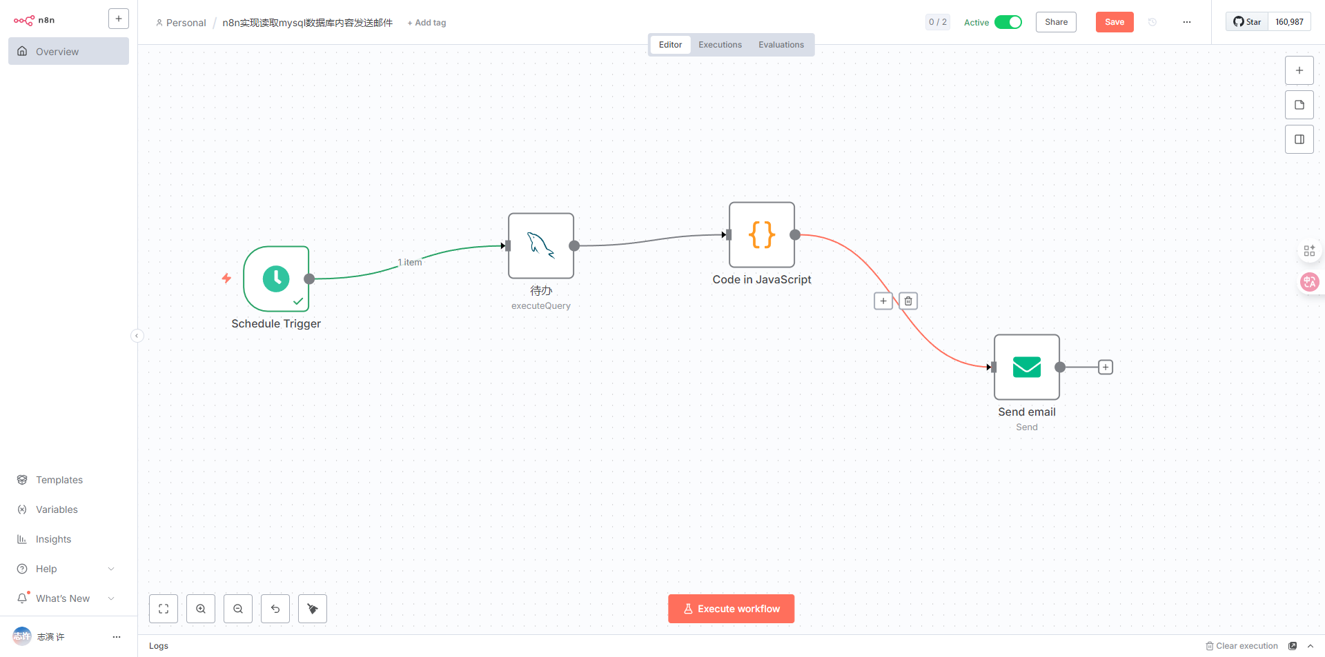 实现效果:n8n每天早上8点和下午5点定时发送邮件,内容为读取数据库layui_admin_template的action_items,发送今日的任务信息,和以前已经超时未完成的任务数据。每日下午总结本天完成的任务情况。